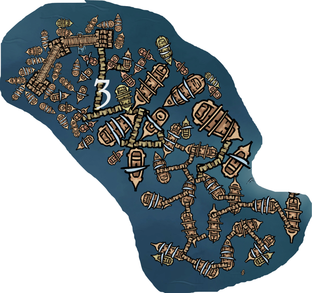 A sprawling collection of small ships, floating bridges, and temporary docks that stretches from the westernmost point of Peregrine Cay out beyond the harbor, the Minnows functions as a lower to middle class residential district. Many ships that don’t come with much in the way of cargo or services end up here, their crews enjoying the multitude of temporary bars and fighting decks, while their captains rent out their deck space for coppers a day. Though small individually, their number ensures that this is the rowdiest of the clusters. Many of the sea god clergy move amongst this group, ministering to the smallest ship crews that often lack dedicated medical and spiritual care. Surprisingly, the Keelhelms, the temporary guard force of the Kohtumine, are frequently found off-duty here or on Peregrine Cay. Many of them are housed in these two clusters. Down-on-their-luck captains see hiring out their ship companies to the Lord of the Oceans as Keelhelms to be an easy way to make some good coin and raise their standing among the various factions.